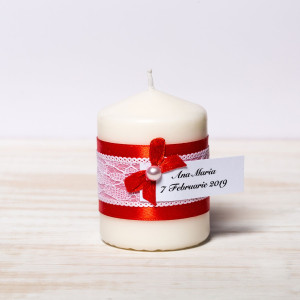 Comanda acum produsul "Marturii lumanari botez banda rosie, dantela alba si fundita asortata".