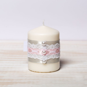 Decorate manual in culori placate, marturiile de botez au o banda lata din satin argintiu lipita de lumanare, o banda alba din dantela fina si un snur roz care se leaga sub forma unei fundite.
