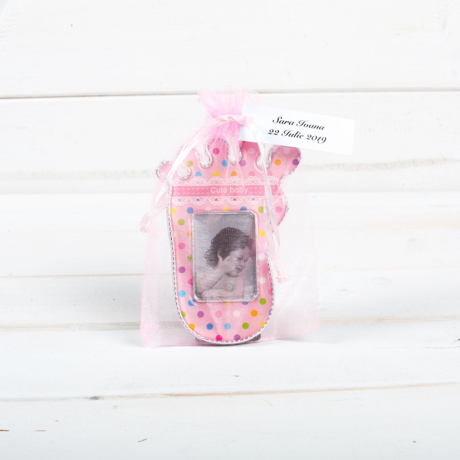 Ramele foto se livreaza cu o fotografie orientatativa ce poate fi inlocuita ulterior cu poza dorita. Pentru ca se ofera ca marturii botez, acestea se daruiesc invitatilor cu poza bebelusului sarbatorit.