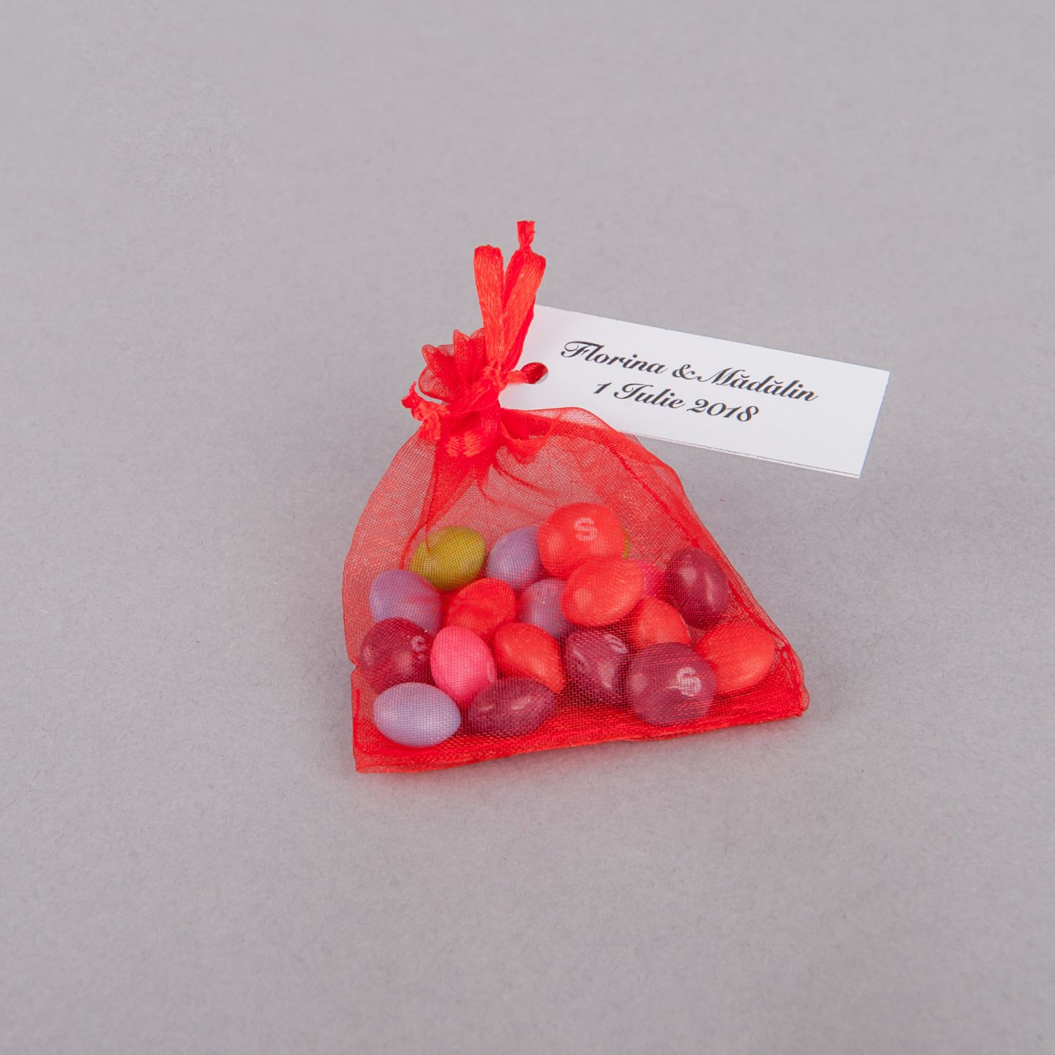 Saculetii din organza se leaga la capat cu un snur asortat dupa ce sunt umpluti cu bomboane. Acestia se pot oferi atat la botezul unei fetite, cat si la botezul unui baietel, rosul fiind o culoare placuta, potrivita pentru ambele sexe.