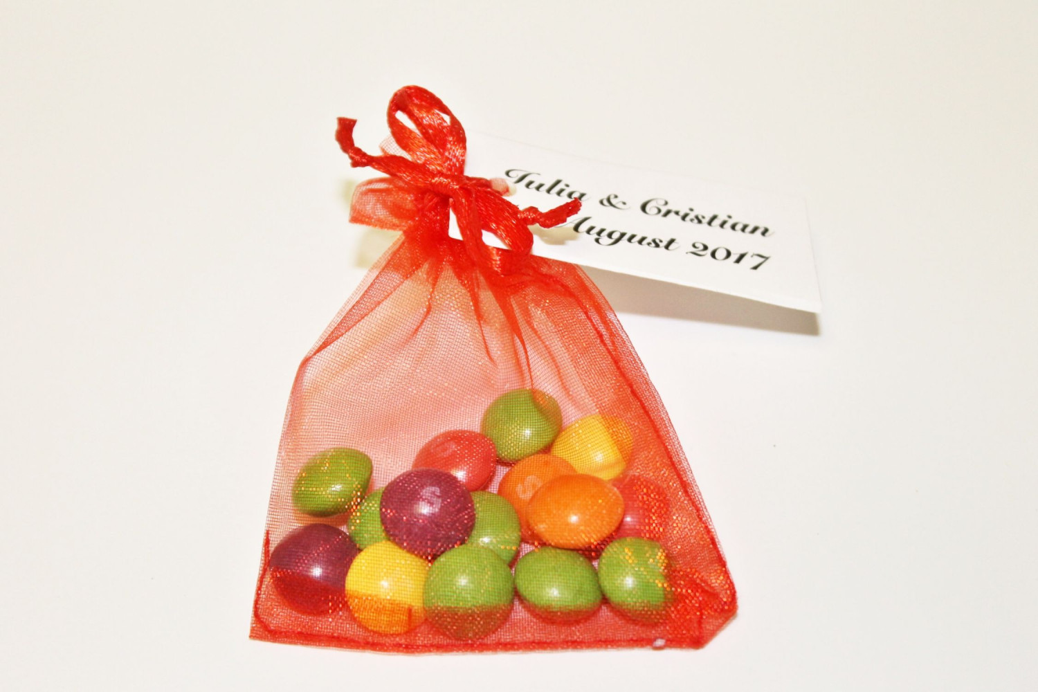Saculetii din organza se leaga la capat cu un snur dupa ce sunt umpluti cu bomboane sau cu mici obiecte. Bomboanele din imagine sunt cu titlu informativ si nu sunt incluse in pret. Nu comercializam bomboane.