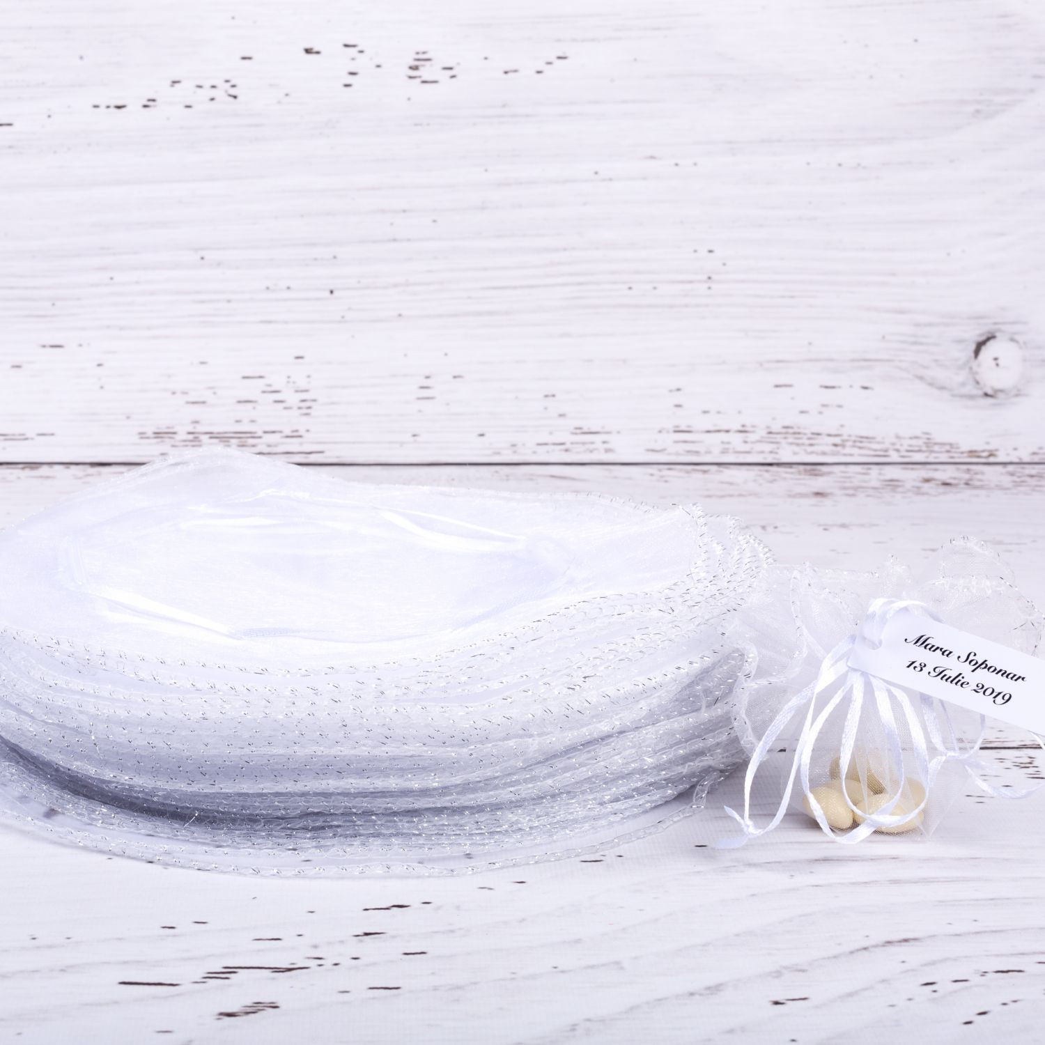Acestia sunt realizati din organza si se leaga cu fundita din saten alb dupa ce i-ai umplut cu mici margele, bomboane, pietricele sau alte accesorii dragute.