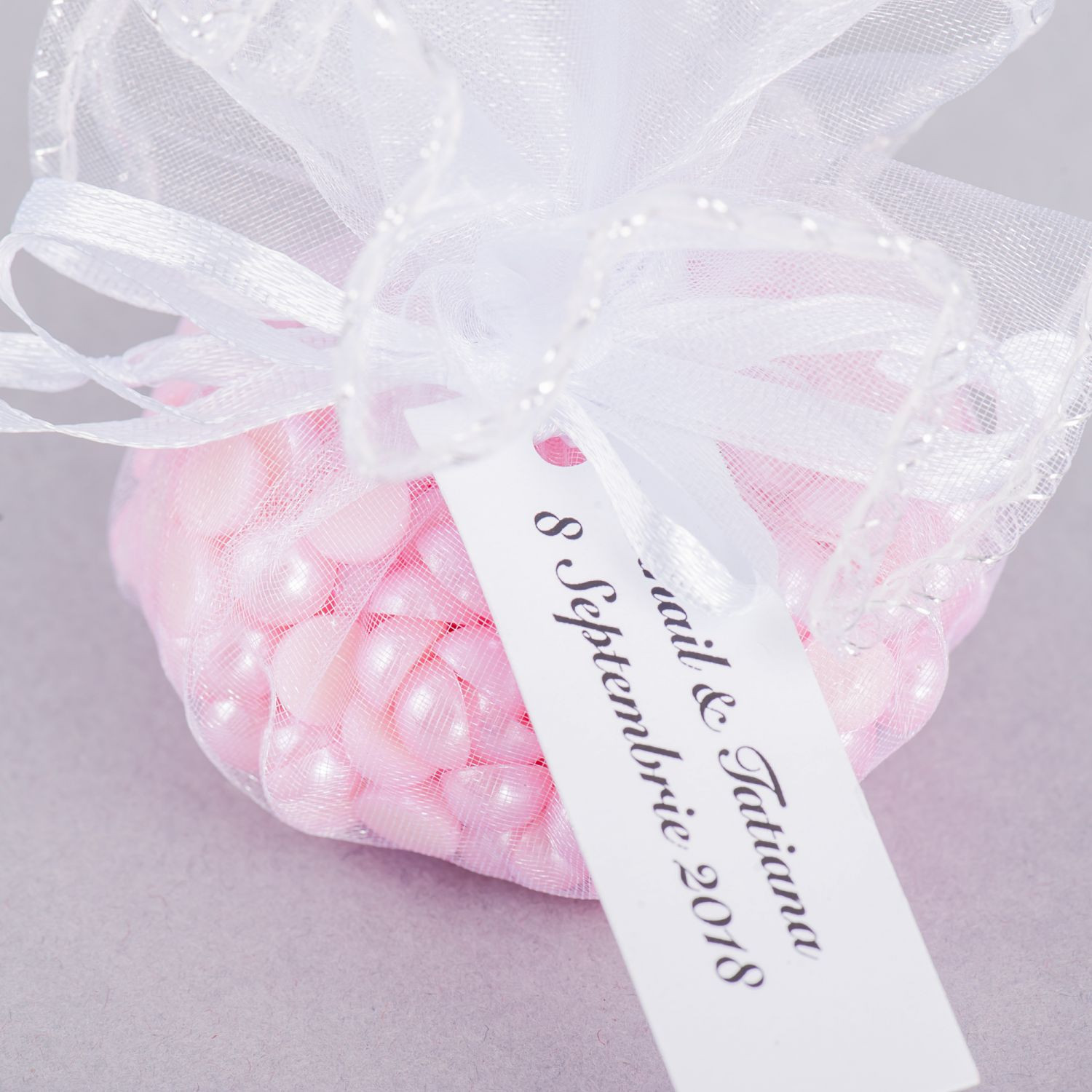 Marturiile au un design atractiv si sunt disponibile in mai multe culori: alb, ivory, mov, lila, bleu, grena si roz. Optional, saculetii din organza rotunzi se pot personaliza cu eticheta.