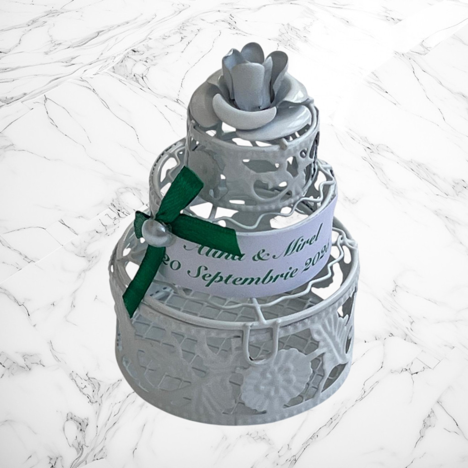 ✔️ Design delicat în formă de tort, realizat din sârmă albă de calitate.