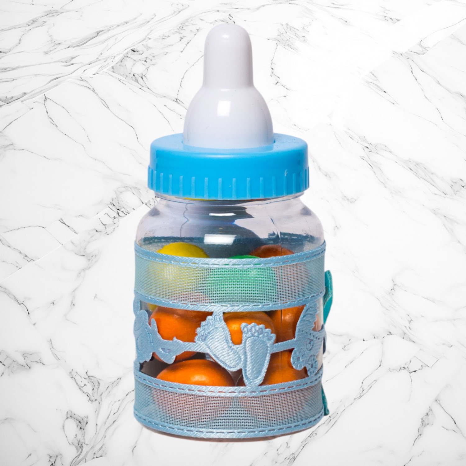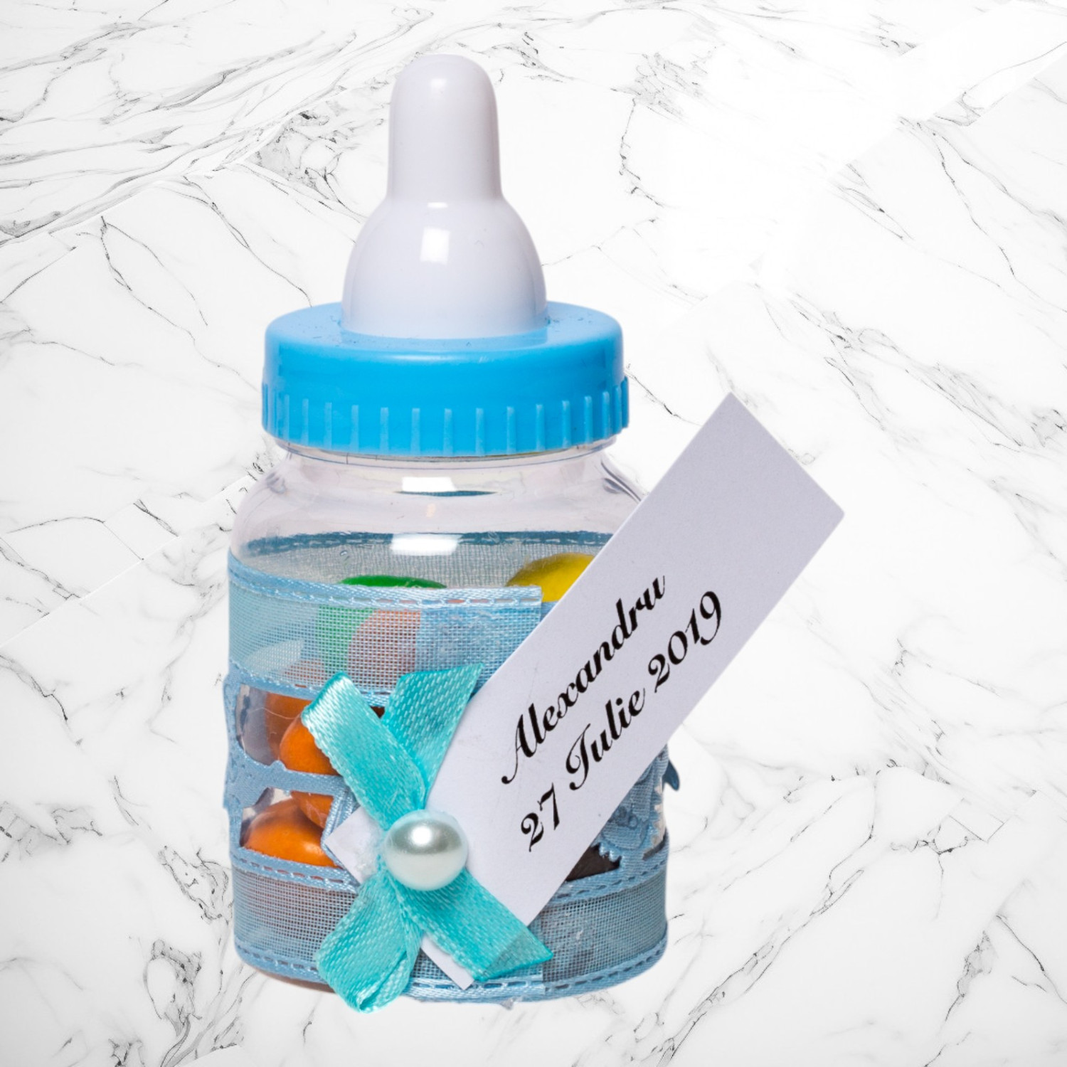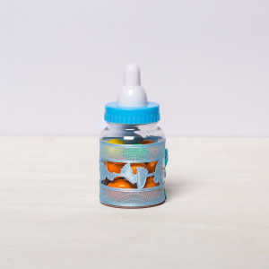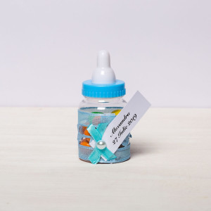 Transformă botezul băiețelului tău într-un eveniment memorabil cu aceste mărturii sub formă de biberon bleu, perfecte pentru a mulțumi invitaților. Realizate din plastic transparent și decorate manual, aceste suveniruri elegante adaugă un plus de rafinament evenimentului tău.