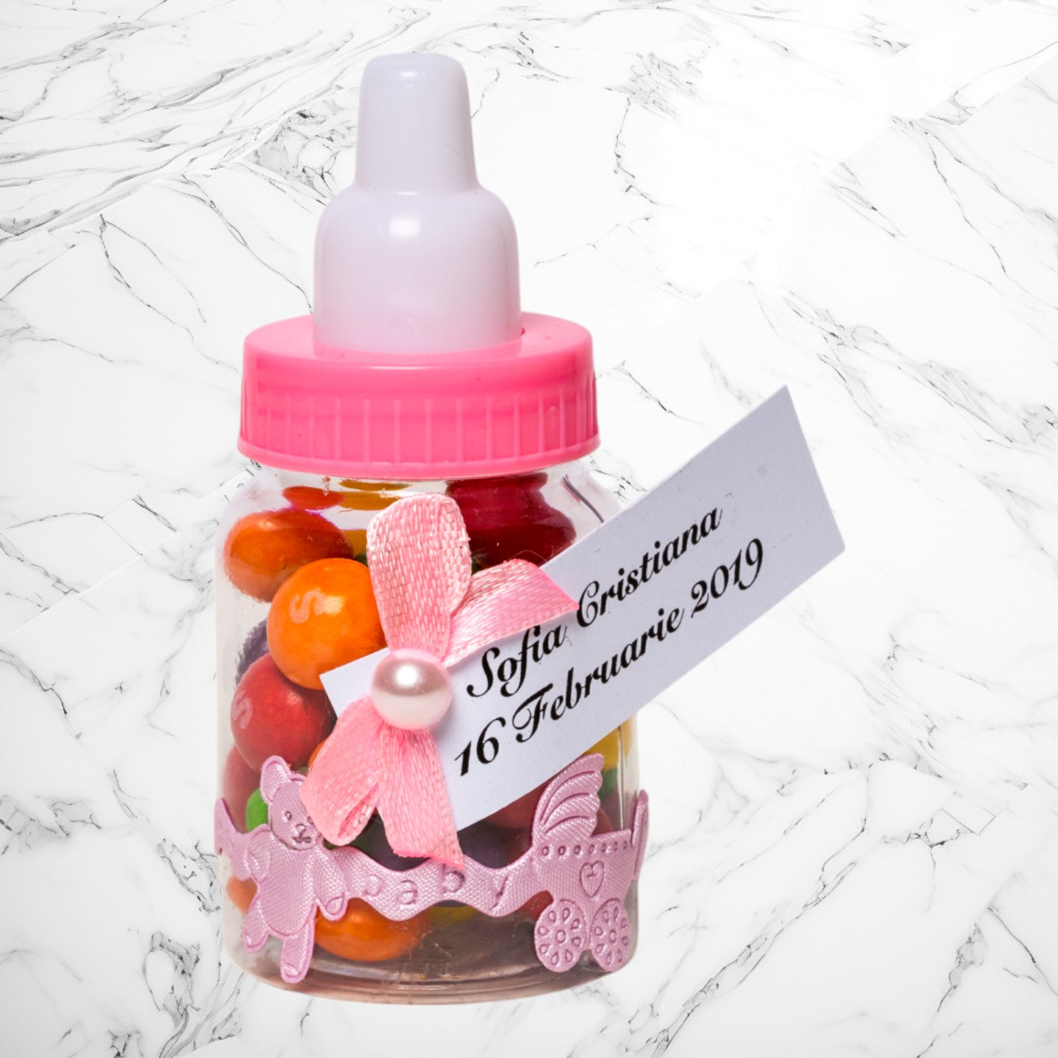 Comanda acum produsul "Marturii botez biberoane roz baveta, carucior, ursulet".