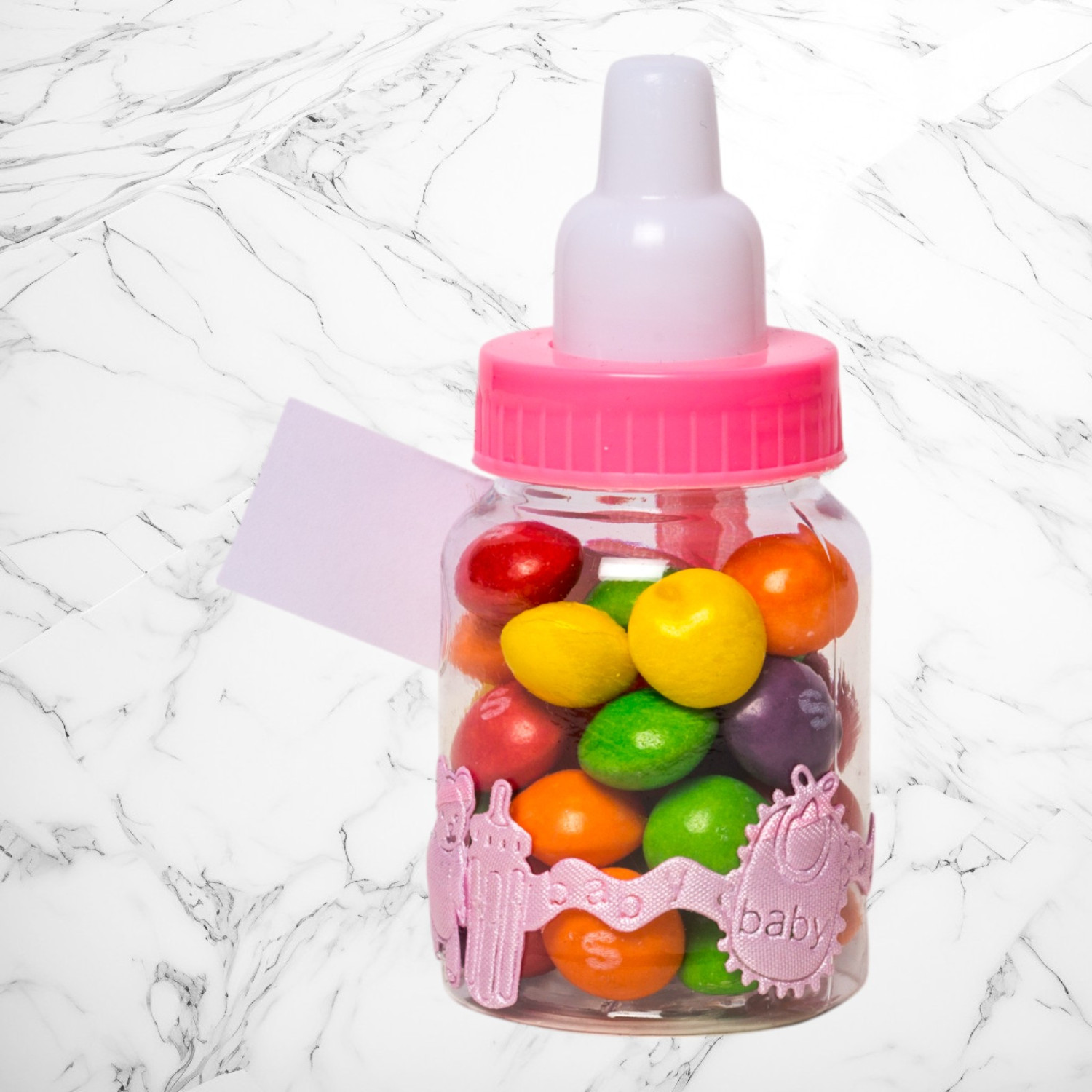 Marturii botez biberoane roz baveta, carucior, ursulet