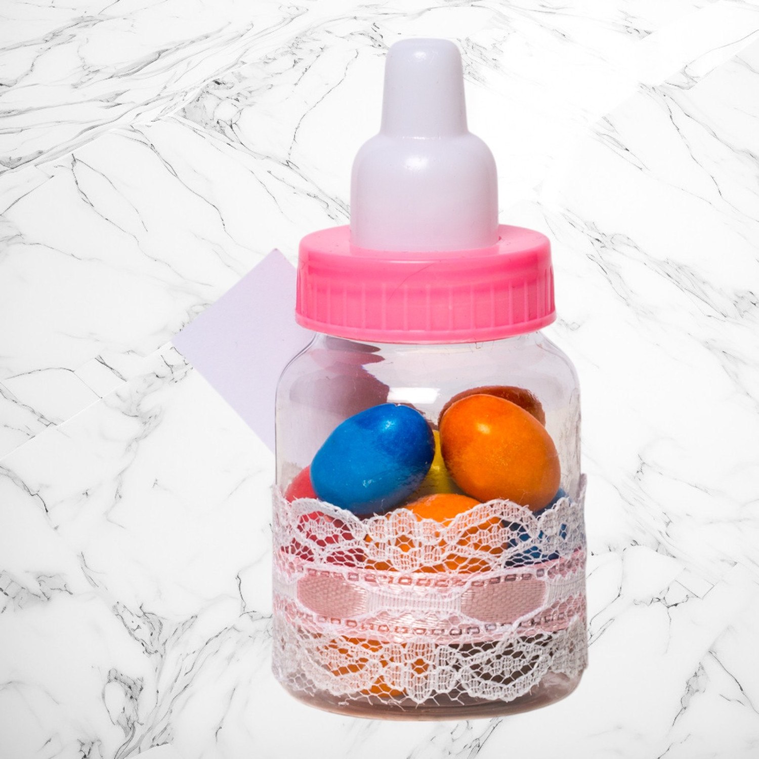 Marturii botez biberoane roz cu dantela alba si fundita roz prafuit