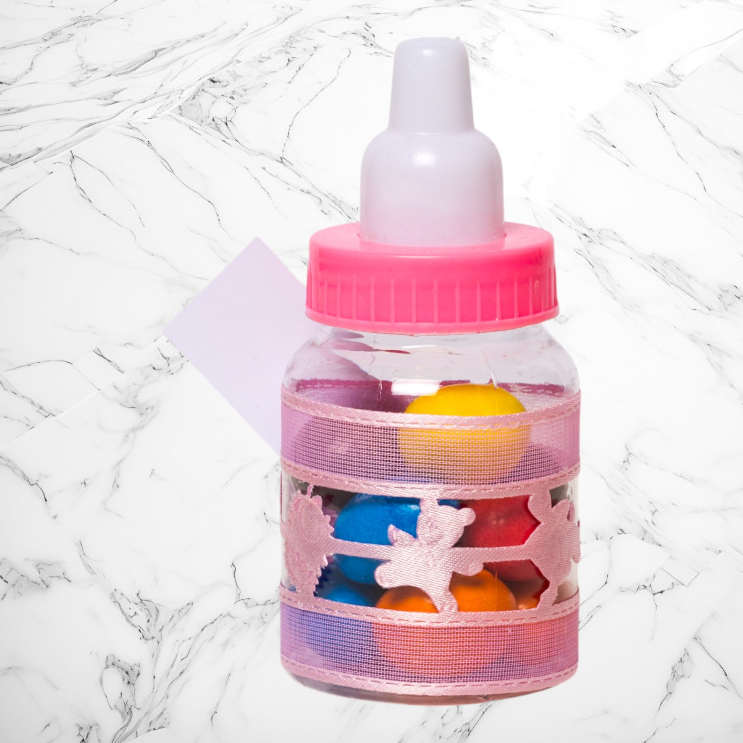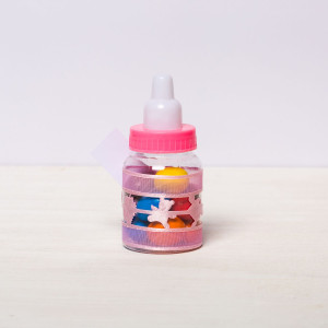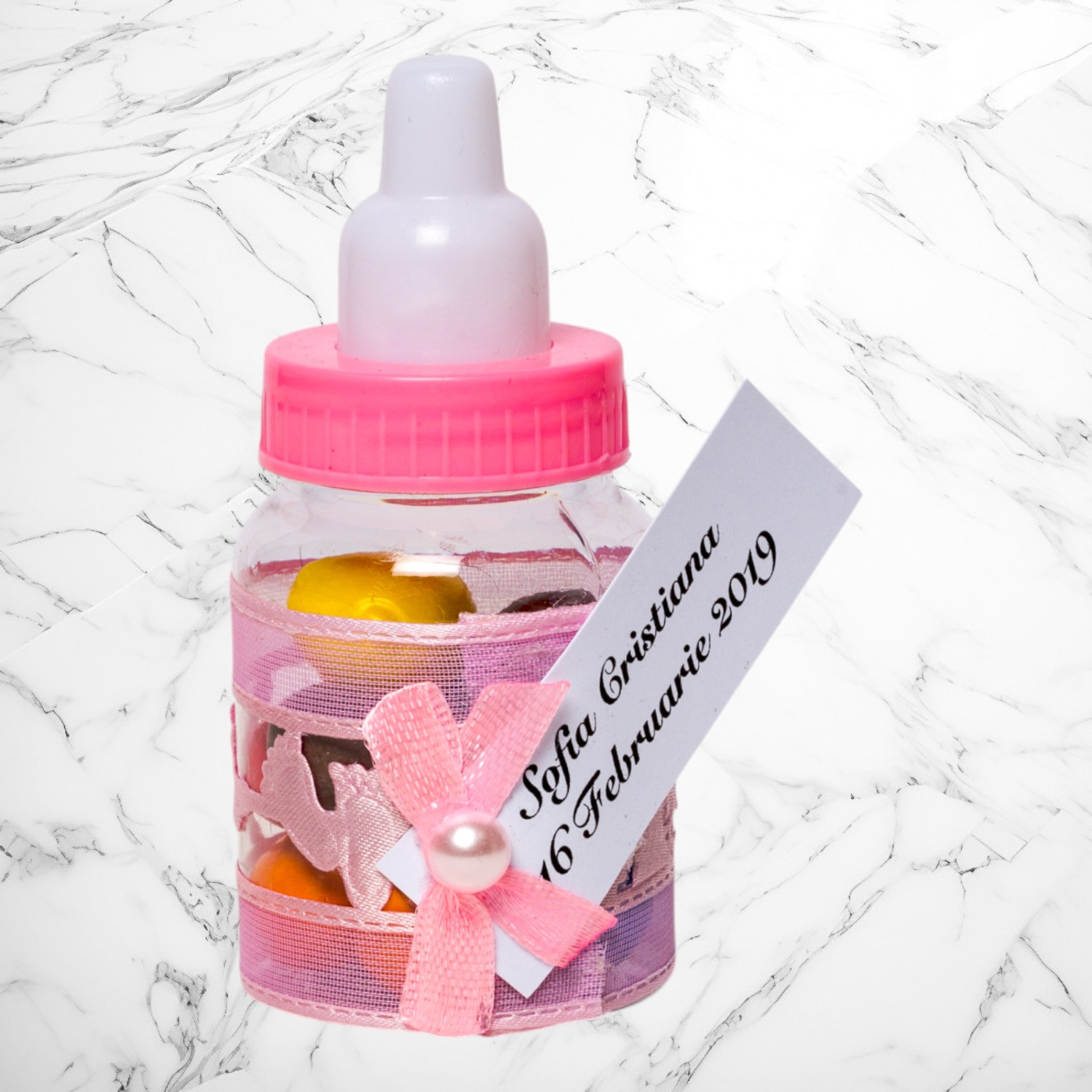 Transformă botezul fetiței tale într-un eveniment memorabil cu aceste mărturii sub formă de biberon roz, perfecte pentru a mulțumi invitaților. Realizate din plastic transparent și decorate manual, aceste suveniruri elegante adaugă un plus de rafinament evenimentului tău.