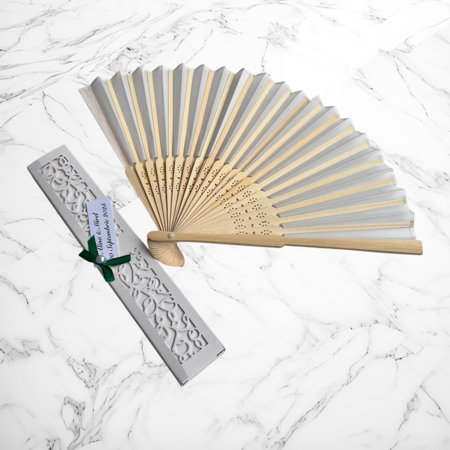 O alegere rafinată și practică pentru invitați, ideală pentru evenimente desfășurate în aer liber sau în sezonul cald! ☀️ Acest evantai din bambus și hârtie decorativă oferă un aer vintage, dar este și extrem de util, fiind un cadou memorabil pentru cei dragi.