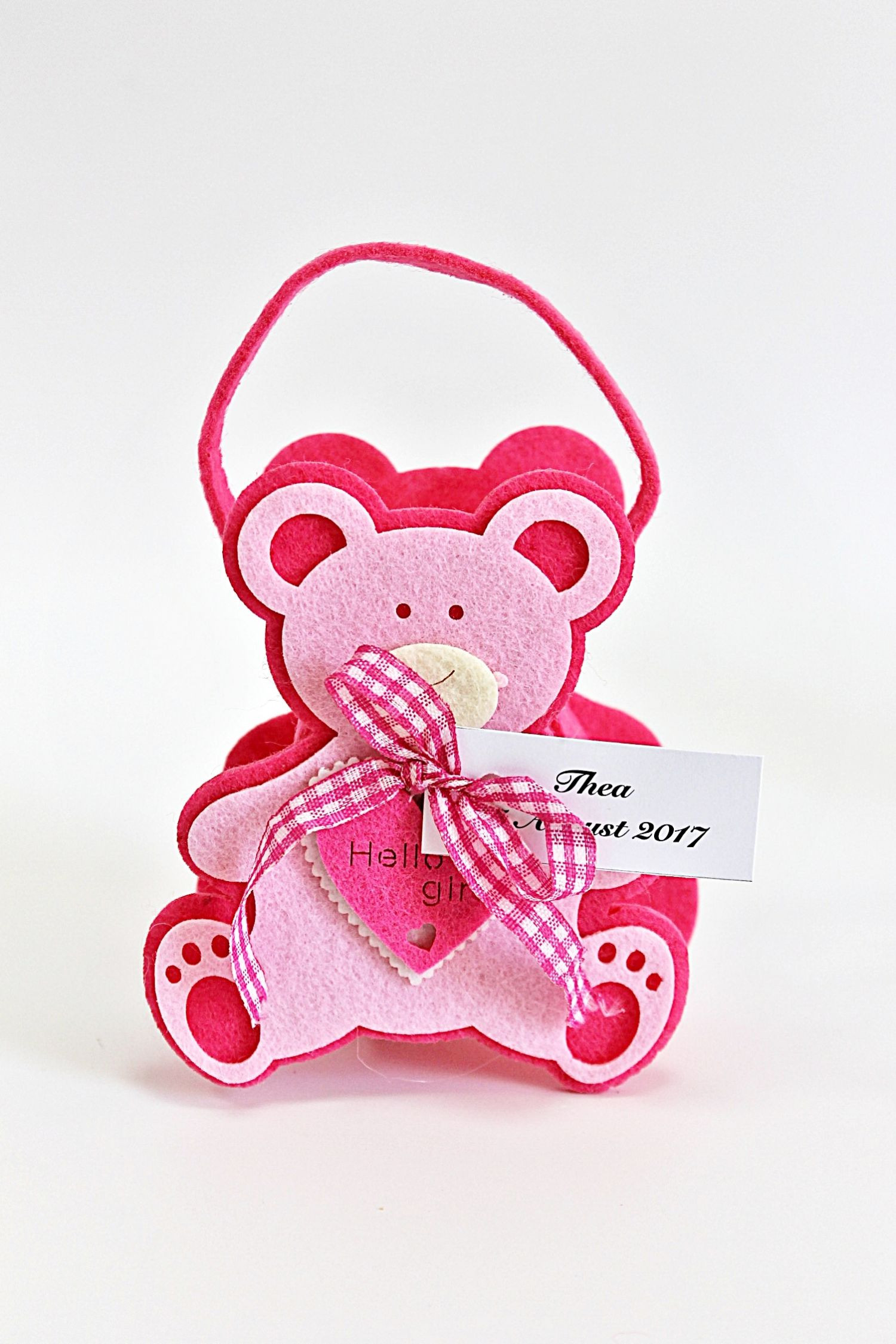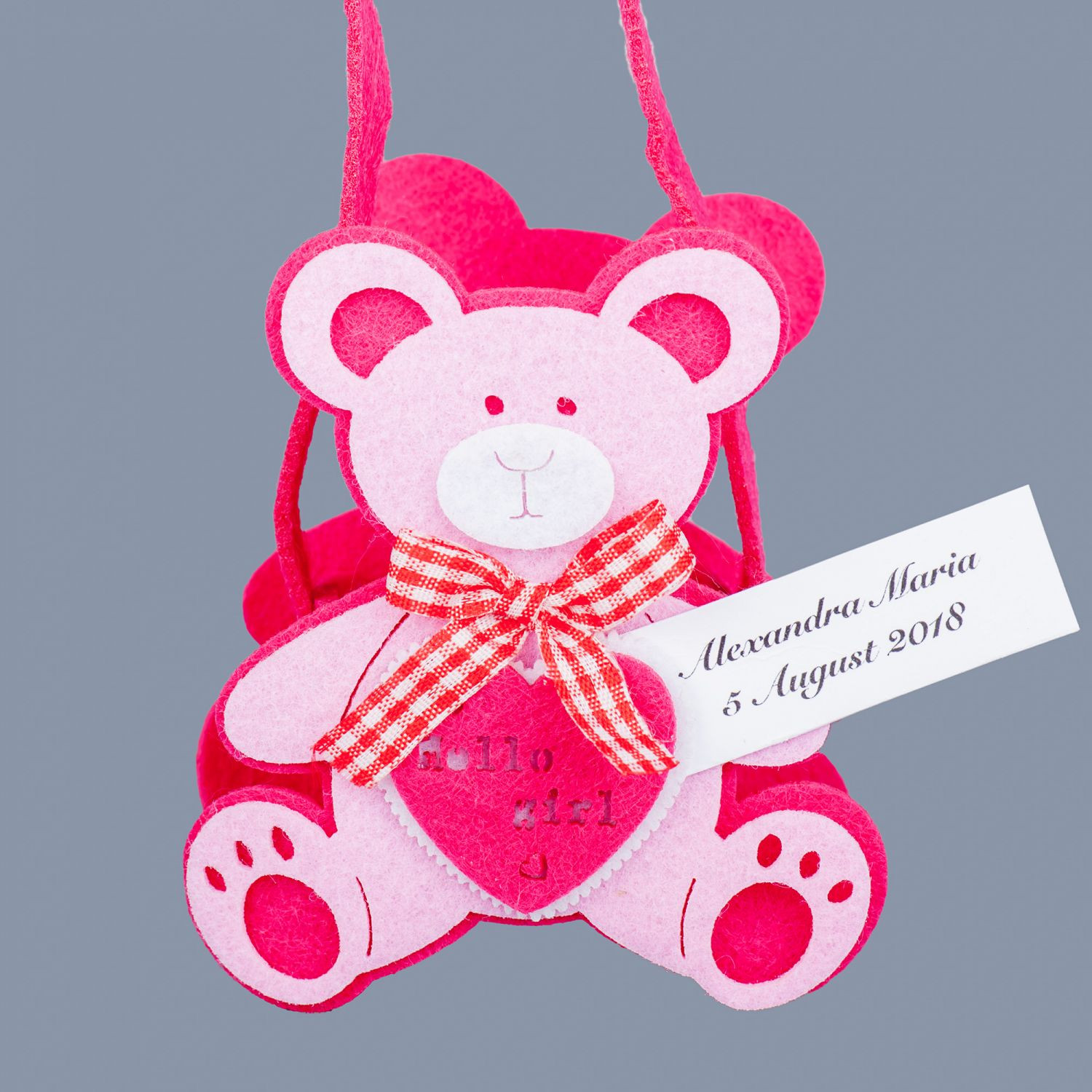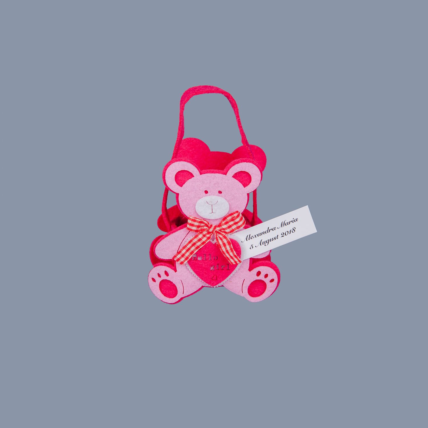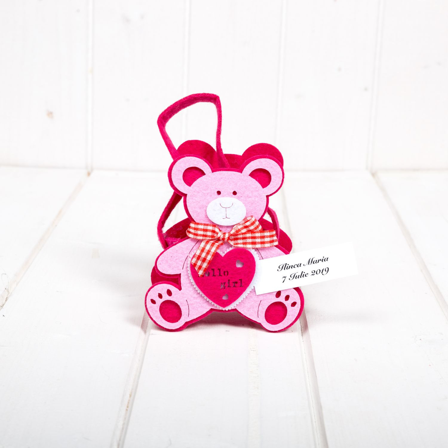Intampina asa cum se cuvine nasterea unei fetite, dar mai ales prima petrecere importanta din viata micutei tale si ofera-le invitatilor prezenti la botez niste cosulete simpatice cu ursuleti roz, pe care este inscriptionat mesajul: Hello girl.