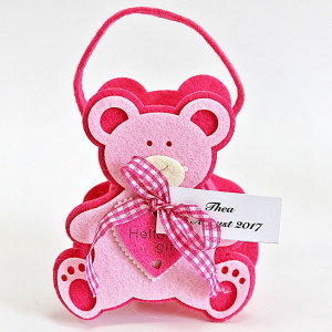 In cosulete poti pune cateva bomboane sau arahide asezate in saculeti din organza. Unul dintre ursuleti are o fundita la gat, de care se poate prinde o eticheta cu numele fetitei si data evenimentului.