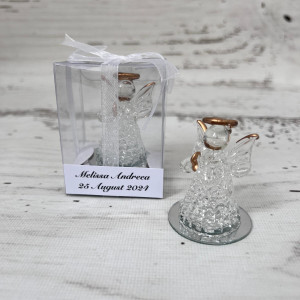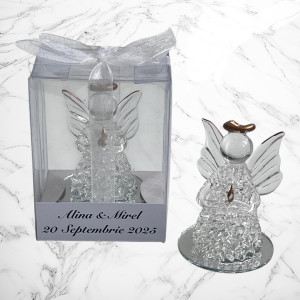 Oferă invitaților tăi o amintire deosebită cu acest îngeraș din sticlă, simbol al binecuvântării și al momentelor speciale din viață. Perfect pentru nuntă sau botez, acest suvenir delicat este realizat din sticlă transparentă, cu detalii atent lucrate, aducând un plus de eleganță și rafinament evenimentului tău.