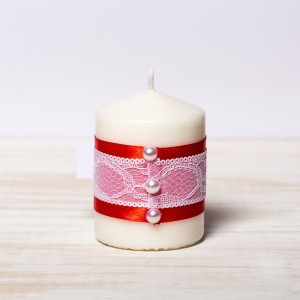 Pentru primul eveniment important din viata unui cuplu de indragostiti, poti alege marturii de nunta deosebite cum sunt lumanarile decorate manual cu o banda lata de culoare rosie, dantela alba, fundita asortata si patru perlute dragalase.