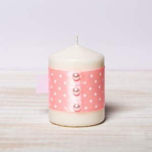 Pentru mirii optimisti si veseli, care vor sa transmita invitatilor la nunta un sentiment de buna dispozitie, pot alege pentru cea mai importanta zi din viata lor marturii decorate festiv cu banda roz cu buline albe, fundita roz si perlute albe.