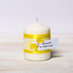 Marturiile de nunta lumanari cu decor manual format din banda din satin galben, dantela alba, fundita galbena si patru perlute albe sunt alegerea perfecta pentru evenimentele programate in sezonul cald.