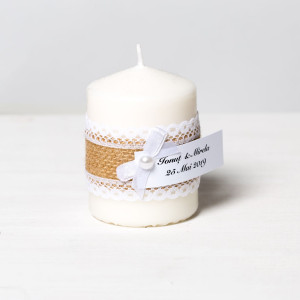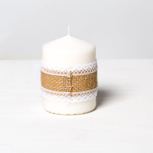 Pentru o nunta in stil rustic, se cuvine ca mirii sa ofere invitatilor prezenti la cel mai important eveniment din viata lor marturii care vin in ton cu tema nuntii, cum sunt lumanarile decorate festiv cu dantela alba si iuta.