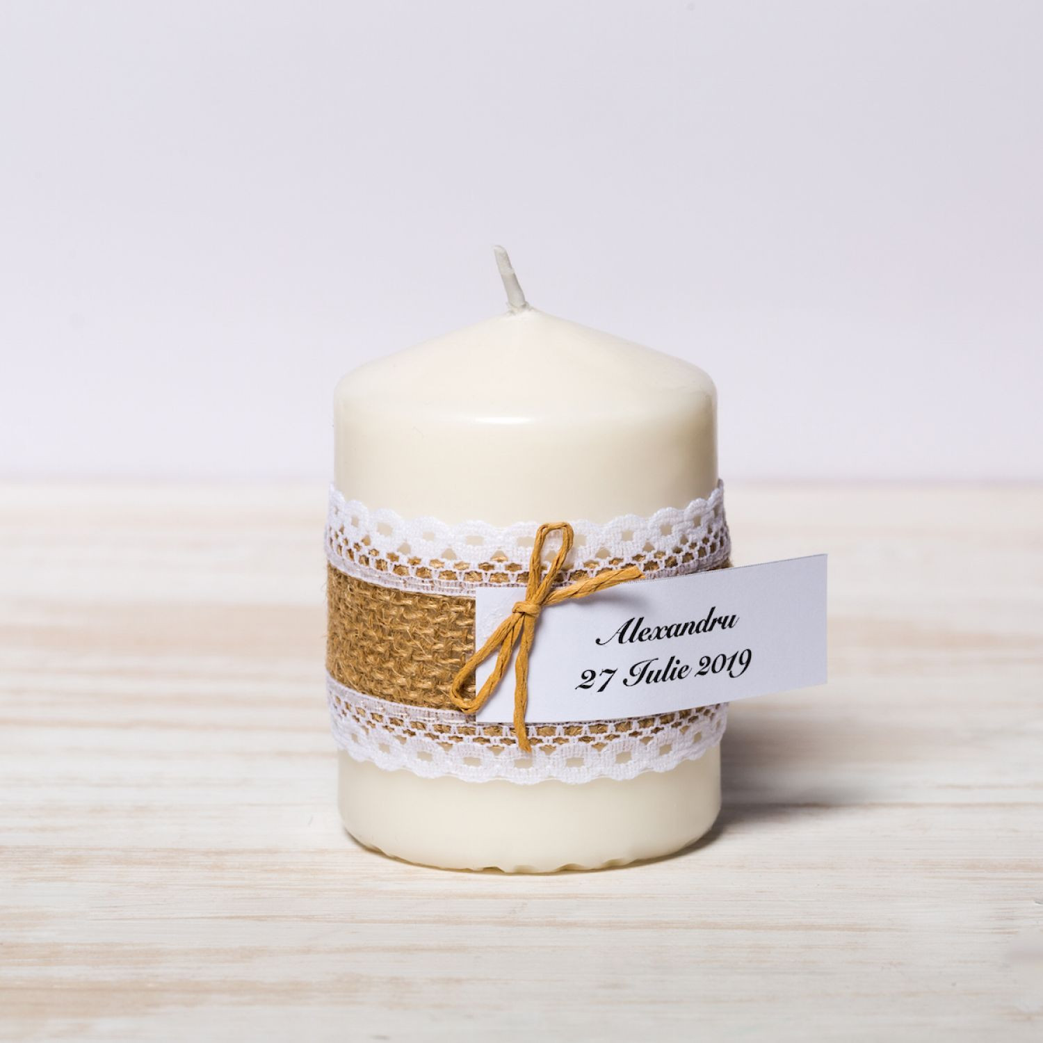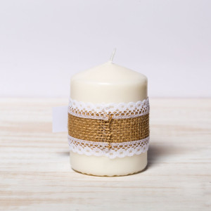 Pentru o nunta in stil rustic, se cuvine ca mirii sa ofere invitatilor prezenti la cel mai important eveniment din viata lor marturii care vin in ton cu tema nuntii, cum sunt lumanarile decorate festiv cu iuta incadrata de dantela alba si fundita sfoara.