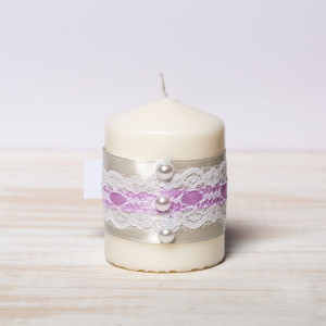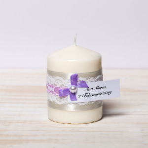 Lumanarile sunt imbracate cu o banda lata din satin argintiu peste care este lipita o banda de dantela. Decorul este completat de o fundita satinata de culoarea lavandei, cu jumatate de perluta alba in mijloc si trei perlute la spate.