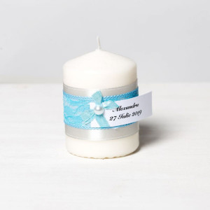 Pentru un eveniment care are in centru obiecte decorative in alb (puritate) si bleu (seninatate), lumanarile decorate festiv cu banda din satin argintiu, dantela bleu si fundita alba cu perlute asortate sunt perfecte pentru o nunta in stil clasic.