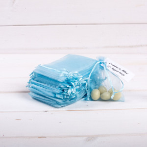Ofera-le invitatilor prezenti la eveniment saculeti organza bleu in cadrul unei nunti cu buget restrans. Acestia se ofera umpluti cu bomboane colorate sau alte mici accesorii dragute (rame foto, accesorii sticla, semne de carte).