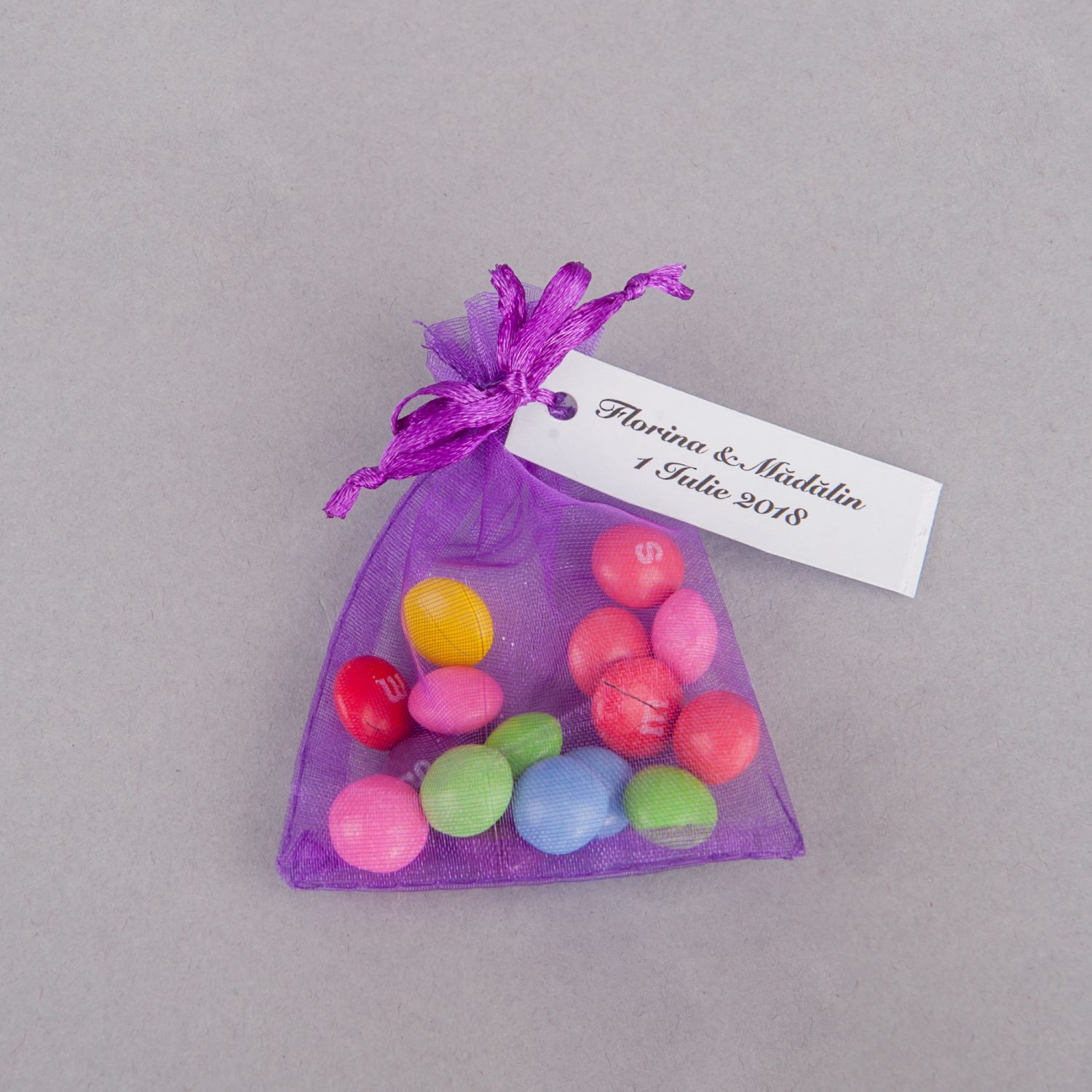 Saculetii mov din organza se leaga la capat cu snur asortat. Acestia se aseaza pe mesele invitatilor la restaurant si pot fi oferiti inca de la inceputul petrecerii, in semn de recunostinta pentru prezenta lor la eveniment.