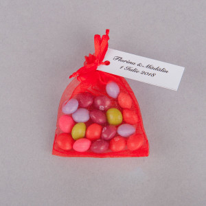 Marturiile saculeti din organza se umple cu bomboane sau alte tratatii dulci si se ofera invitatilor in semn de multumire pentru prezenta lor la eveniment.