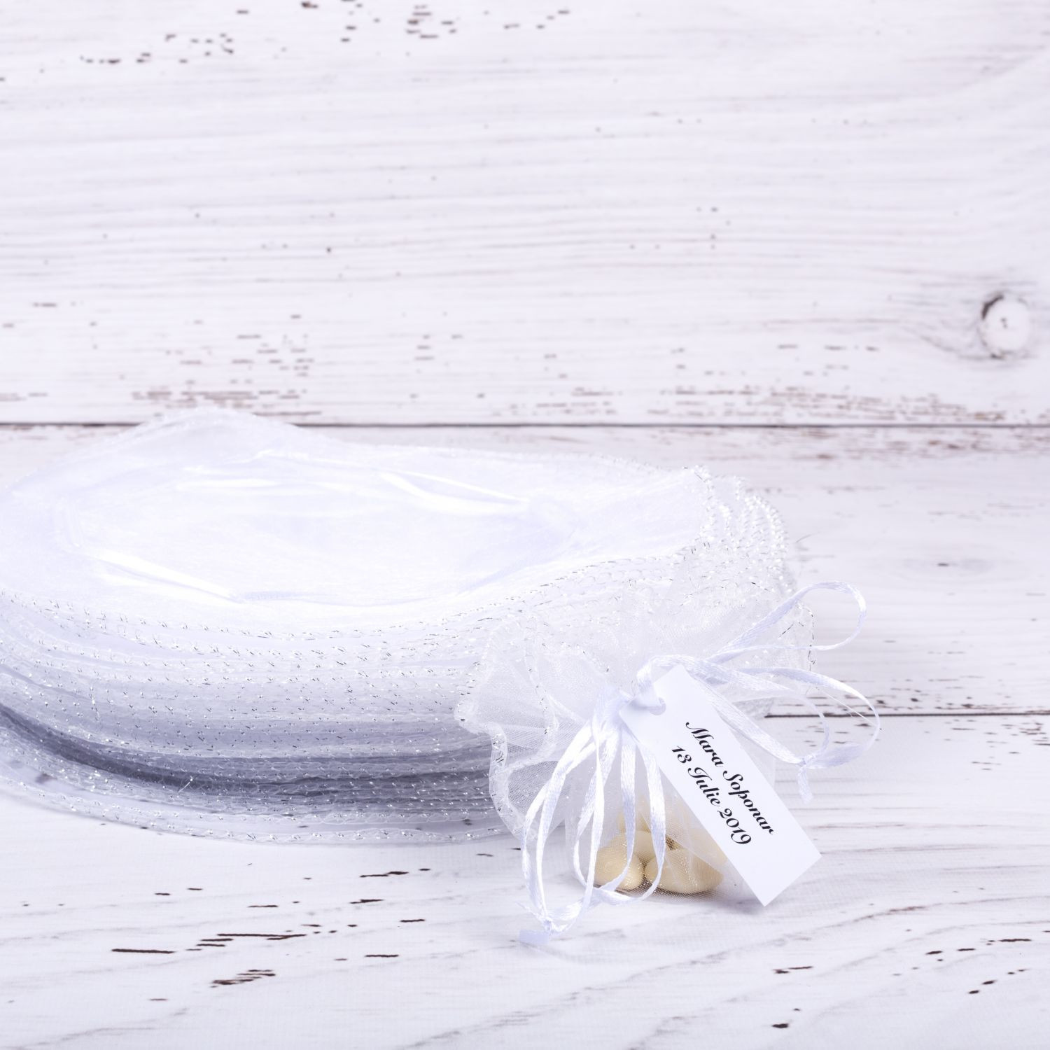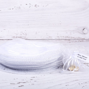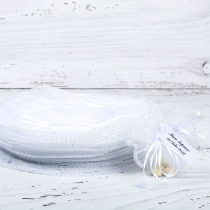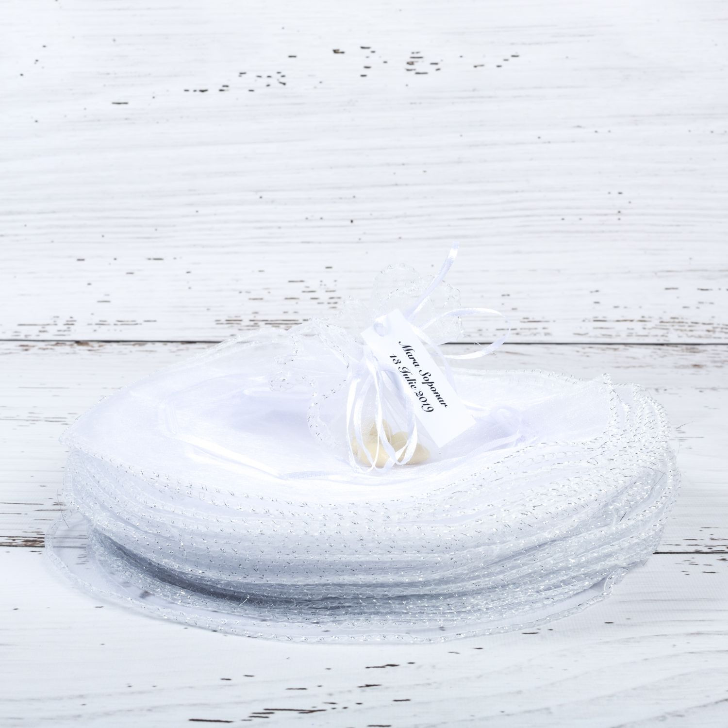 Marturiile saculeti din organza cu forma rotunda si margine tivita cu fir argintiu sunt alegerea potrivita pentru o nunta eleganta, cu tematica "Alba ca zapada".