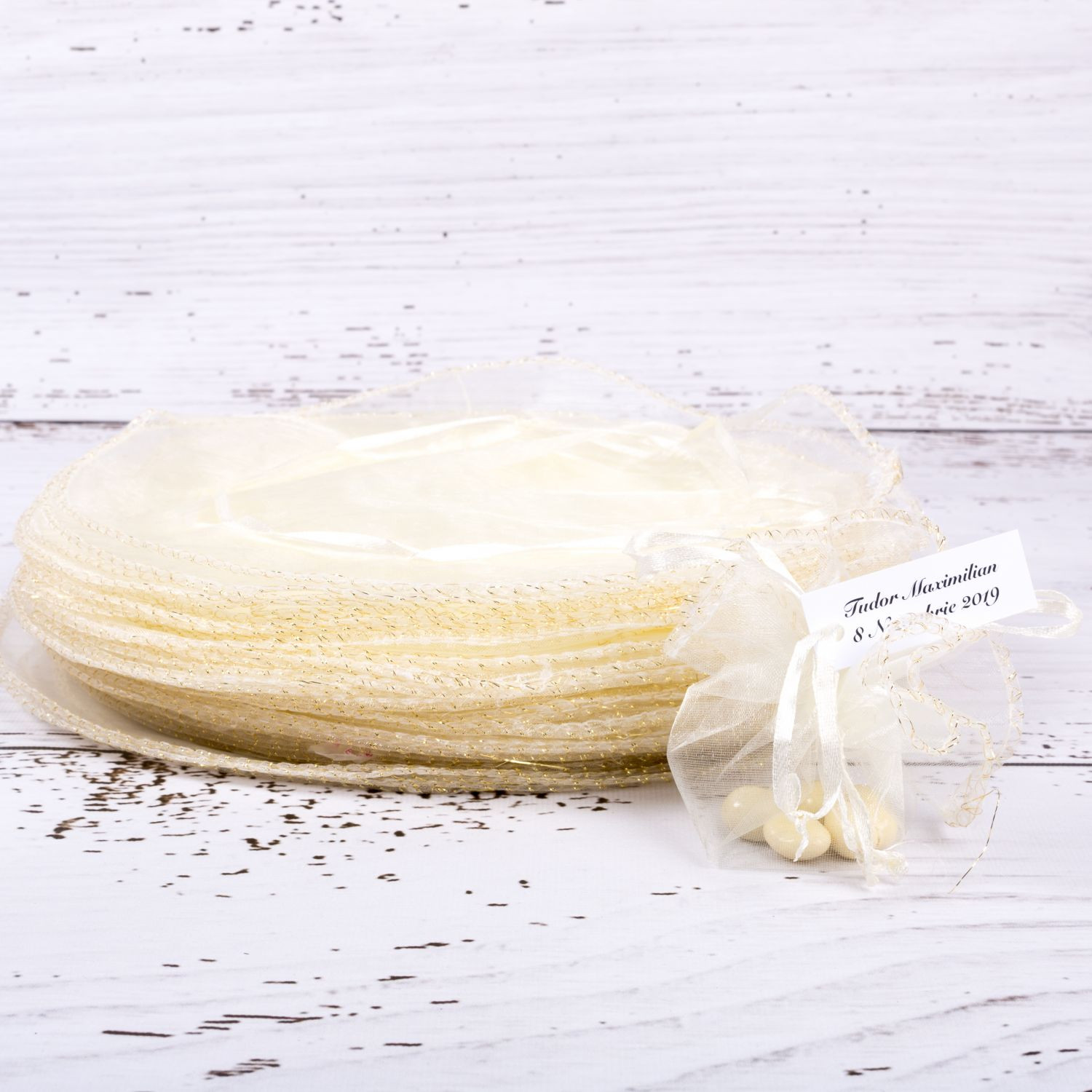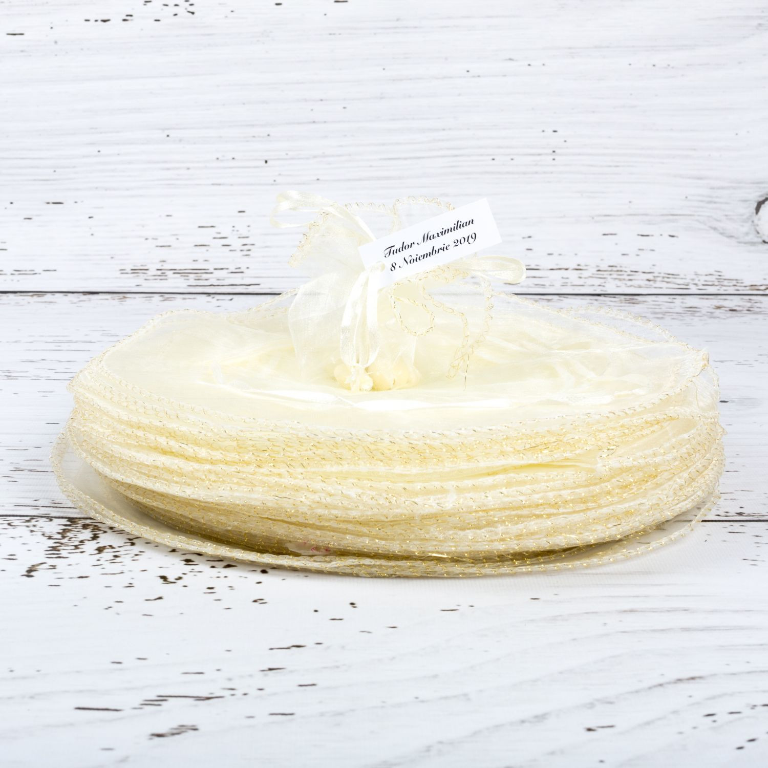 Invitatii vor folosi cu siguranta saculetii dupa nunta pentru a-si pastra in ei micile bijuterii. Acestia se leaga cu un snur decorat pe margini cu fir auriu. Optional, saculetii pot fi personalizati cu eticheta pe care se trece numele mirilor si data evenimentului.