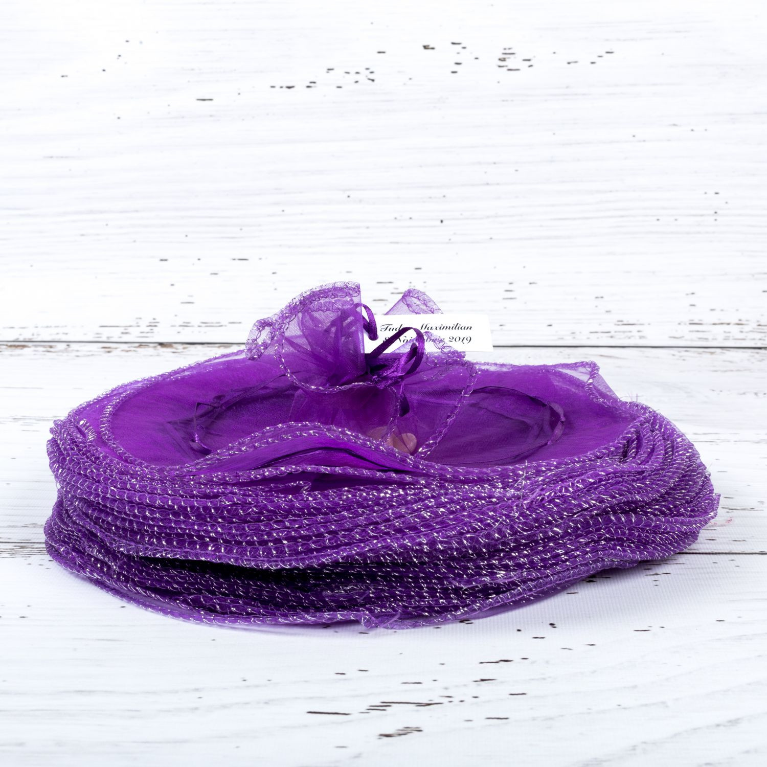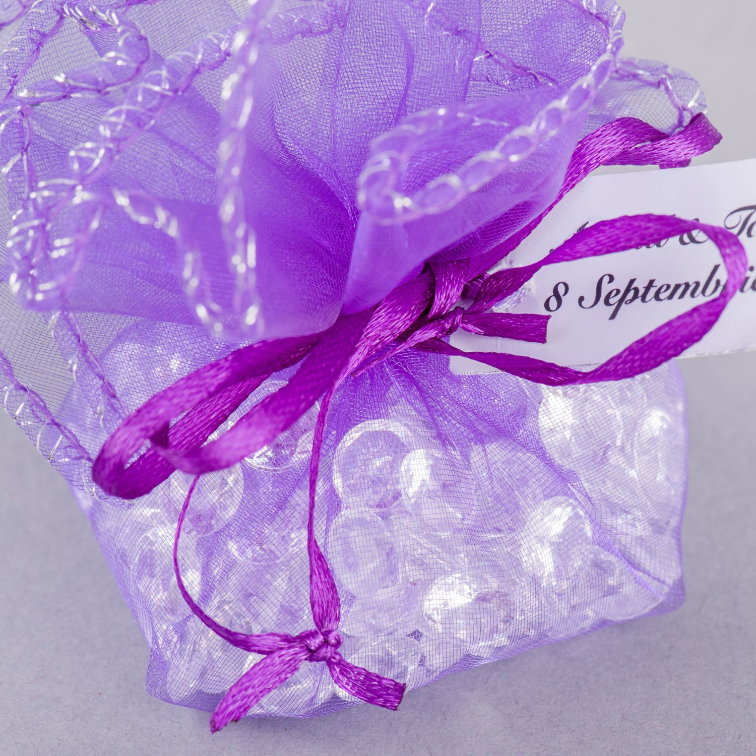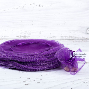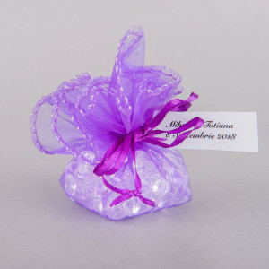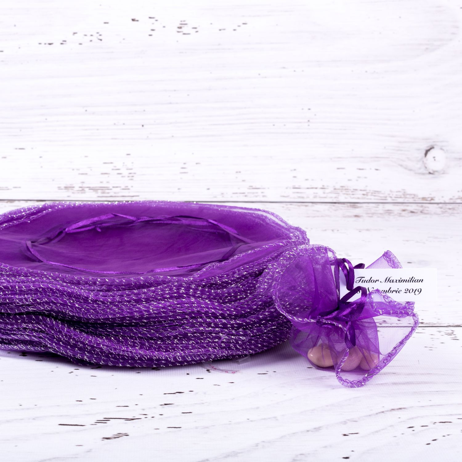 Marturiile de nunta saculeti mov cu fir argintiu reprezinta o alegere mereu actuala pentru evenimentele din sezonul cald. Saculetii organza de forma rotunda se asociaza perfect unei nunti regale.