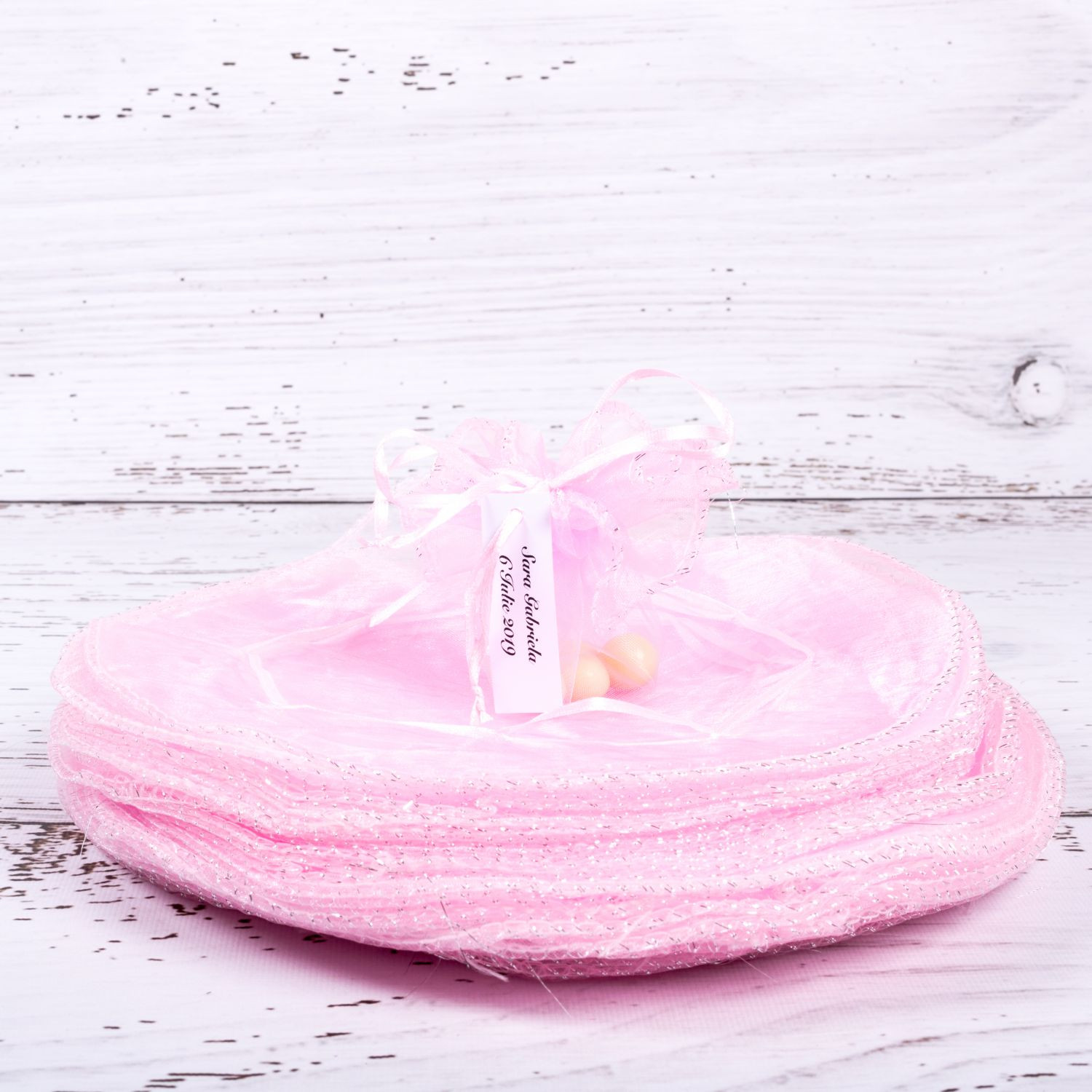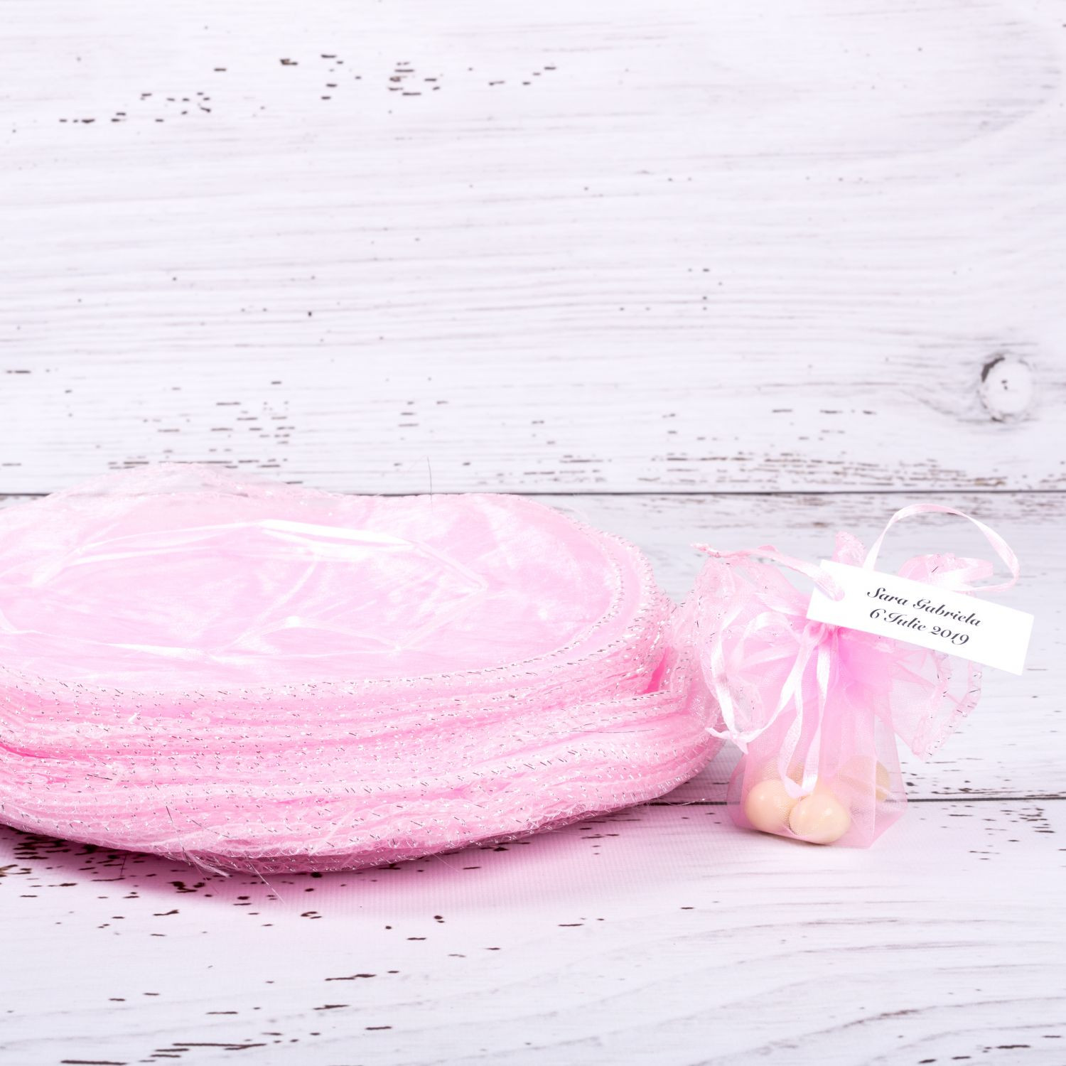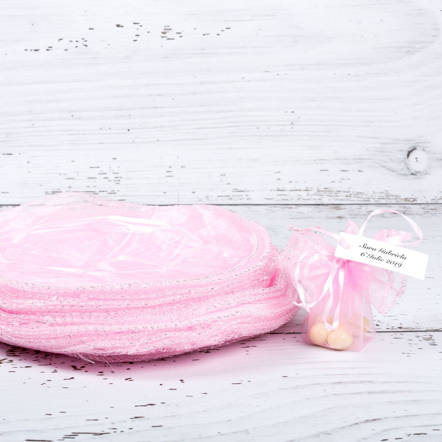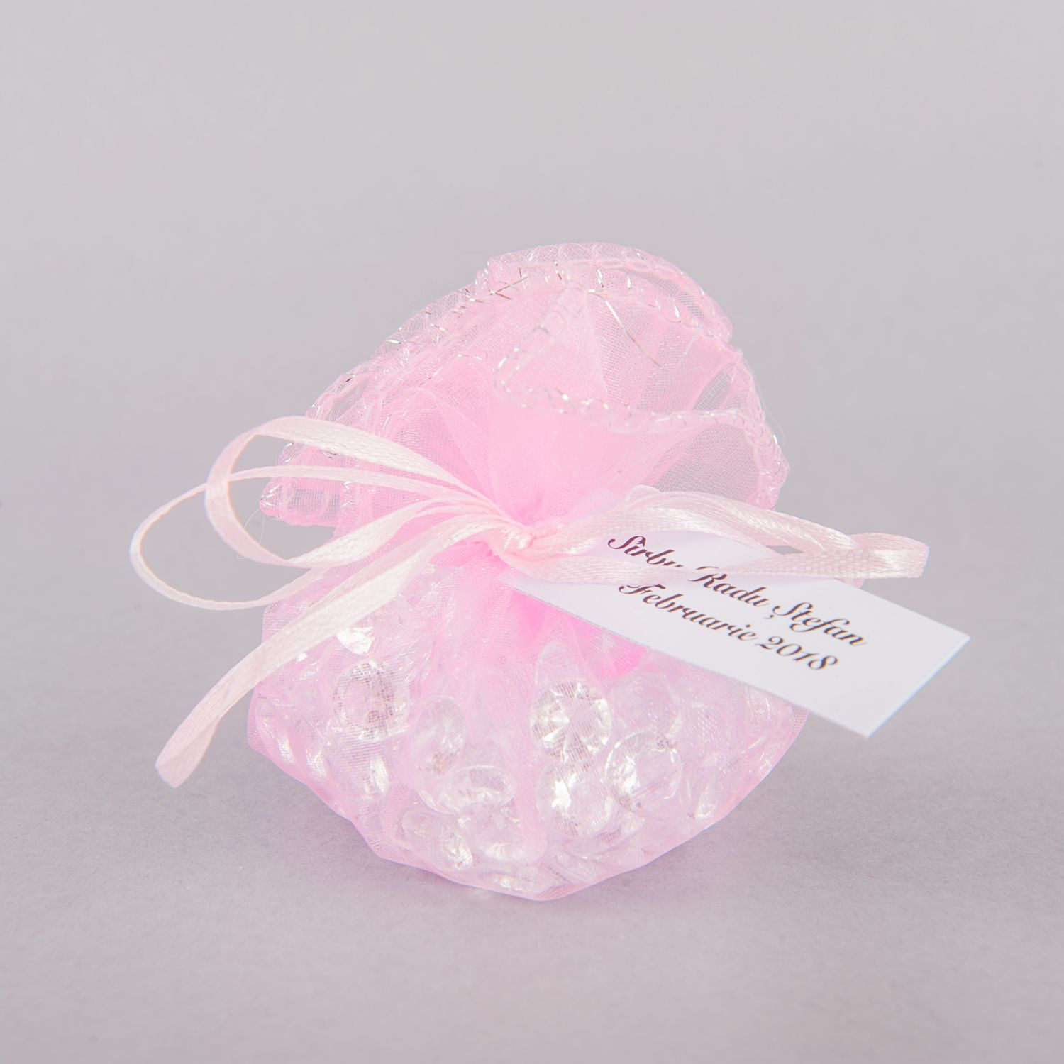 Marturiile de nunta saculeti roz cu fir argintiu reprezinta o alegere mereu actuala pentru evenimentele din sezonul cald. Saculetii organza de forma rotunda se asociaza perfect unei nunti cu tema Optimism.