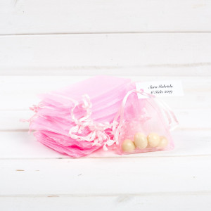 Saculetii din organza se leaga la capat cu un snur dupa ce sunt umpluti cu bomboane.