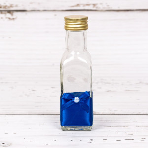 Sticluta de mir este acel accesoriu esential pentru botezul oricarui copilas. Pentru ca orice detaliu conteaza, sticluta de mir poate fi decorata manual cu banda albastra, fundita in aceeasi culoare si perluta, daca va primi taina botezului un baietel.