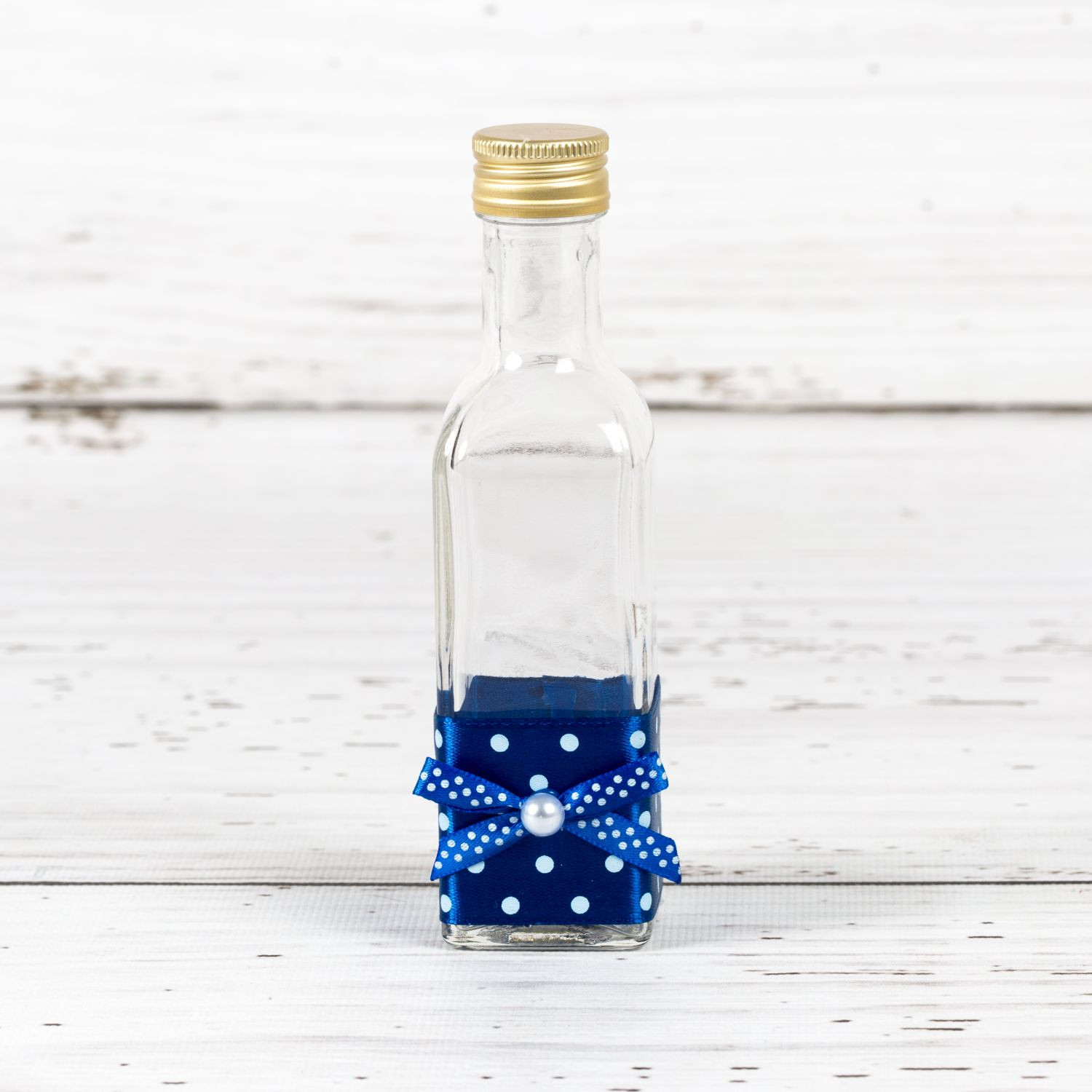 Sticluta este decorata manual in Atelierul SelfEvents.ro cu banda albastra cu buline, fundita asortata si perluta. Aceasta se livreaza goala, fara ulei alimentar.