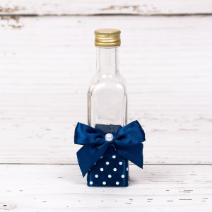 Sticluta este decorata manual in Atelierul SelfEvents.ro cu banda bleumarin cu buline, fundita asortata si perluta. Se livreaza goala, fara ulei.
