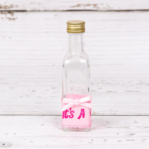Daca urmeaza botezul fetitei tale, alege o sticluta de mir cu decor sugestiv, cum este aceasta sticluta cu banda roz It s a girl si fundita asortata cu jumatate de perluta in mijloc.
