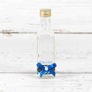 Pentru un botez autentic romanesc, parintii/nasii unui baiat pot alege accesorii biserica cu model etnic, cum este sticluta de mir decor traditional si fundita albastra.