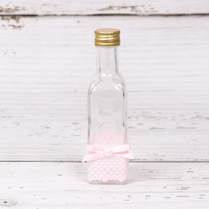 Pentru o fetita, nasii micutei ar putea sa aleaga sticluta de mir cu decor banda roz cu buline si fundita asortata cu perluta in mijloc, in timp ce parintii au datoria sa vina la biserica cu ulei si vin, pentru taina mirungerii, respectiv taina impartasaniei.