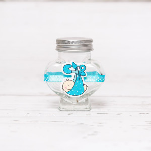 Pentru botezul unui baietel dragalas, nasii acestuia pot alege o sticluta de mir cu figurina baietel si banda turcoaz cu buline albe. Sticluta este decorata manual in Atelierul SelfEvents.ro.