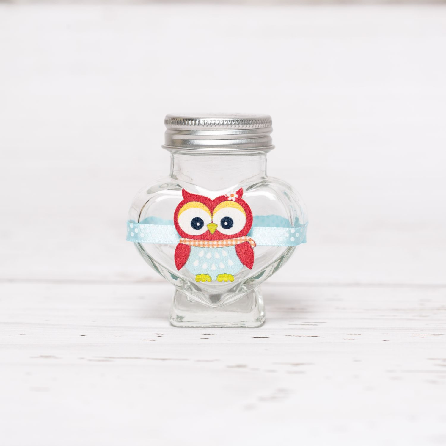 Pentru botezul unui copilas, nasii acestuia pot alege o sticluta de mir simpatica cu decor banda bleu cu buline albe si figurina bufnita. Sticluta este decorata in Atelierul SelfEvents.ro, se livreaza goala si poate fi umpluta ulterior cu ulei din comert (de floarea-soarelui sau de masline).