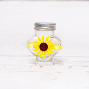 Aceasta sticluta de mir in forma de inima cu banda galbena si figurina din fetru floarea-soarelui este perfecta atat pentru botezul unei fetite, cat si pentru botezul unui baietel. In timp ce culoarea galbena transmite buna dispozitie, floarea-soarelui este simbolul optimismului si sperantei, iar in cazul sticlutei de mir cu acest model, parintii bebelusului sau nasii acestuia ureaza copilasului o viata plina de impliniri.