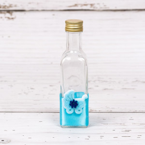 Sticluta este decorata manual in Atelierul SelfEvents.ro cu banda bleu si carucior bleu din fetru.