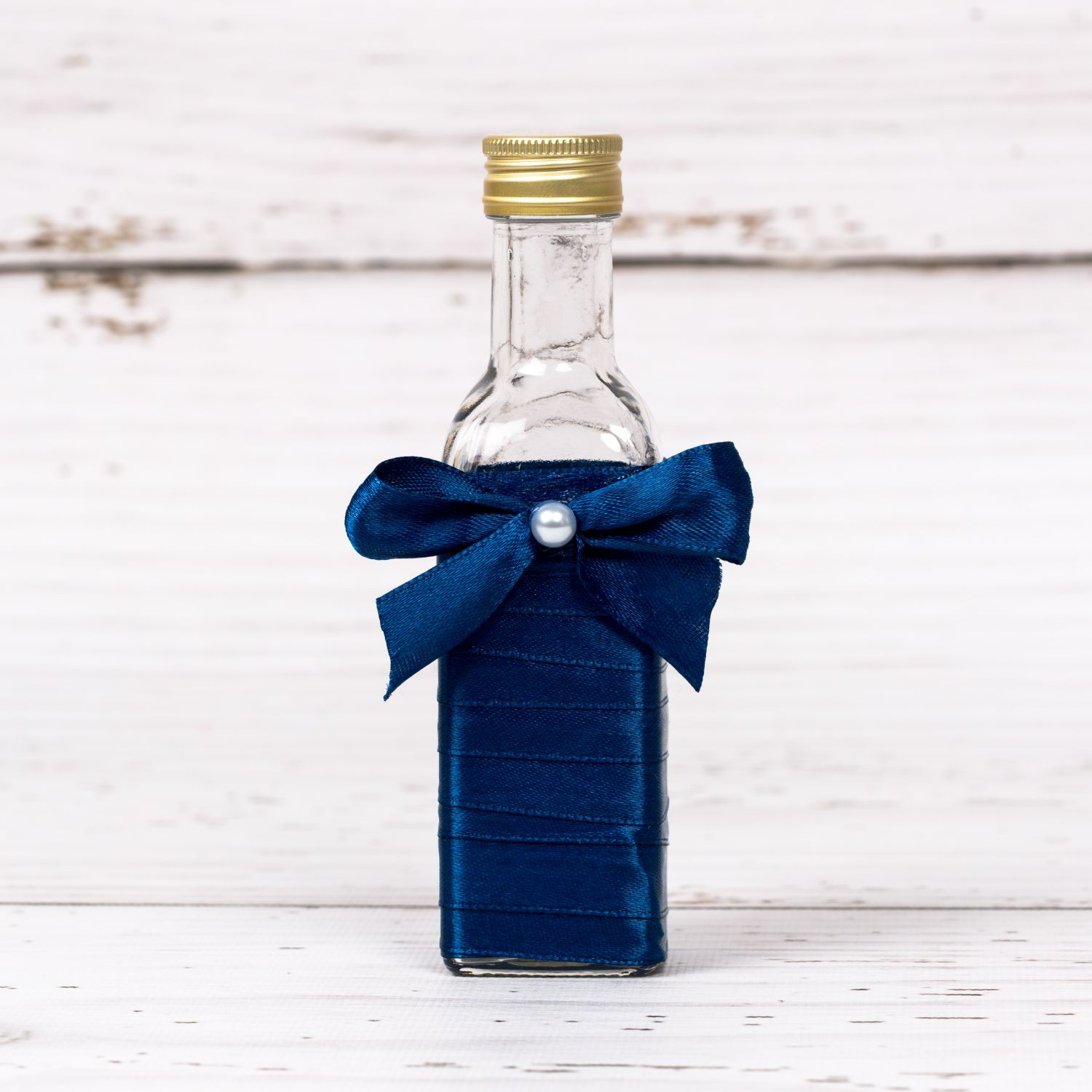 Sticluta este decorata manual in Atelierul SelfEvents.ro cu banda bleumarin, fundita asortata si perluta. Sticluta se livreaza goala, fara ulei.