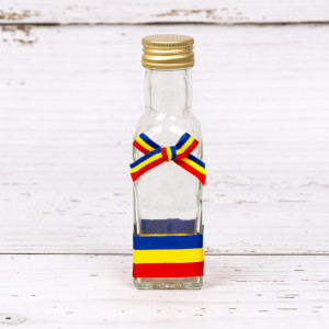- Sticluta mir cu decorata cu steagul tricolor. Dimensiuni: 15 cm inaltime x 4 cm lungime x 4 cm latime. Capacitate: 100 ml.