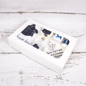 Pentru ca ziua botezului simbolizeaza inceputul vietii religioase pentru un mic crestin, nasii unui baietel pot alege pentru finutul lor un trusou bleumarin cu dantela si cu text sugestiv.