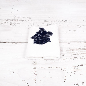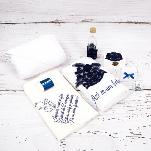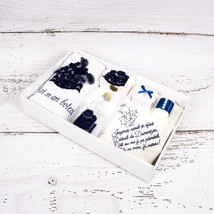 Trusoul bleumarin are o lucratura din dantela care scoate in evidenta lucrurile bebelusului, iar panza de mir si panglica din set sunt brodate cu litere de mana.