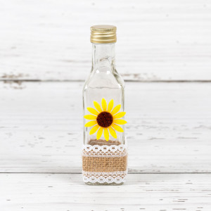 - Sticluta pentru mir cu decor iuta si floarea-soarelui. Aceasta are capacitate de 100 ml si este decorata cu steagul tricolor si floarea-soarelui. In sticluta se pastreaza uleiul sfintit care este folosit de catre preot in timpul slujbei pentru mirungerea micutei crestine, dar si la baita de a doua zi.