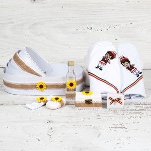 Pentru ceremonia de botez organizata cu ocazia crestinarii unui baietel, nasii micutului pot alege un trusou botez cu motive populare, cum este trusoul botez traditional cu baieti, iuta, banda tricolor si floarea-soarelui.