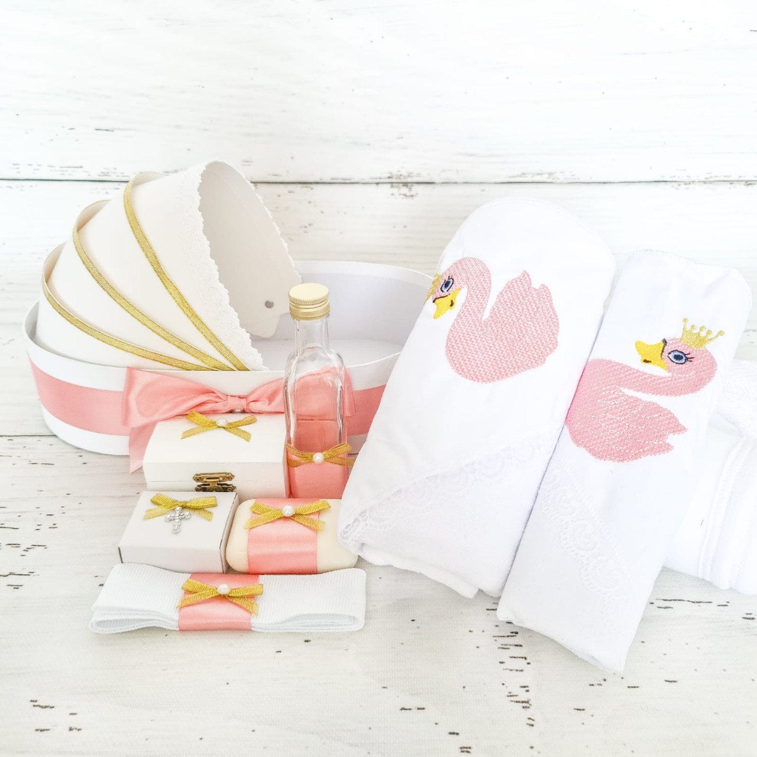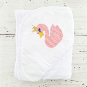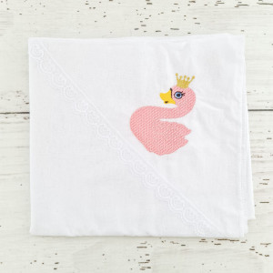 Trusoul botez cu decor roz si lebada brodata pe panza de mir si prosopul bebelusului reprezinta o alegere sugestiva pentru ziua in care o fetita intra oficial in randul crestinilor. Prin urmare, daca esti nasa unei fetite si vrei sa alegi accesorii biserica cu personaje indragite, acest trusou va fi in mod sigur apreciat de parintii finutei tale.