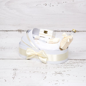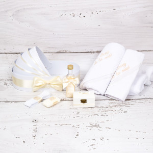 Trusoul botez ivory cu fundite si dantela este potrivit atat pentru fetite, cat si pentru baieti, datorita culorii sale neutre. Acesta este elegant si cutia landou este ideal pentru transportul pieselor din trusou.